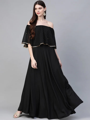Black & Golden Foil Printed Detail Off-Shoulder Layered Maxi Dress