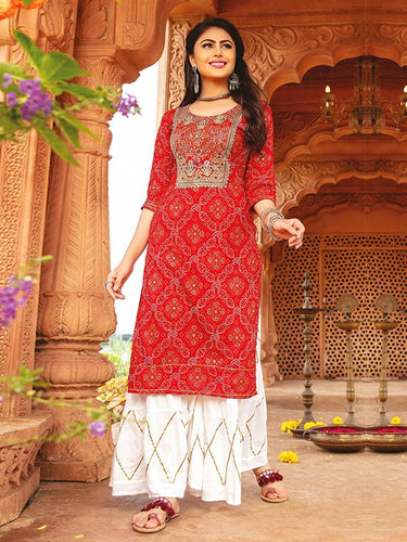 Kala Niketan Bandhani Red Rayon Embroidered Kurti With Stylish Sharara