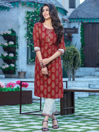 Kala Niketan Maroon Printed Rayon Kurti with off White Pant