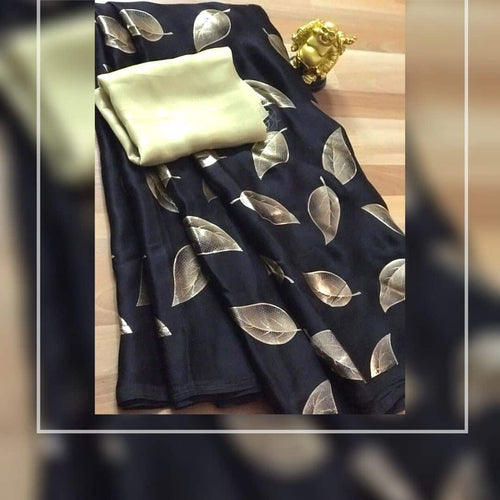 Kala Niketan Black satin silk saree with golden satin Blouse