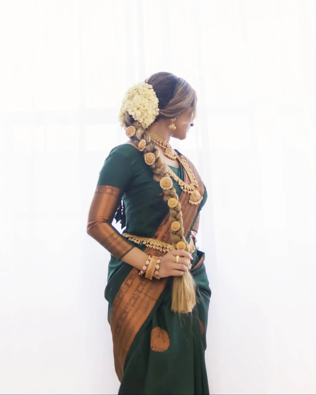 Colour your world and spread fresh ethnic vibes everywhere by donning this dazzling and enthralling beauty. Crafted in a blend of Green , this resplendent soft Banarasi silk saree is an idealistic drape to ace the look and get in the spotlight. Choose this style statement soaked in regal vibes, and stun everyone.